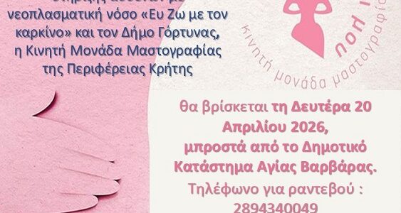 Η Κινητή Μονάδα Μαστογραφίας της Περιφέρειας Κρήτης συνεχίζει την διαδρομή της προσφοράς, με στόχο την πρόληψη του καρκίνου του μαστού και σταθμεύει την Δευτέρα 20 Απριλίου 2026, στην Αγία Βαρβάρα (Δημοτικό Κατάστημα) και την Τετάρτη 29 Απριλίου 2026, στους Αγίους Δέκα (πάρκινγκ, όπισθεν του Δημαρχείου).