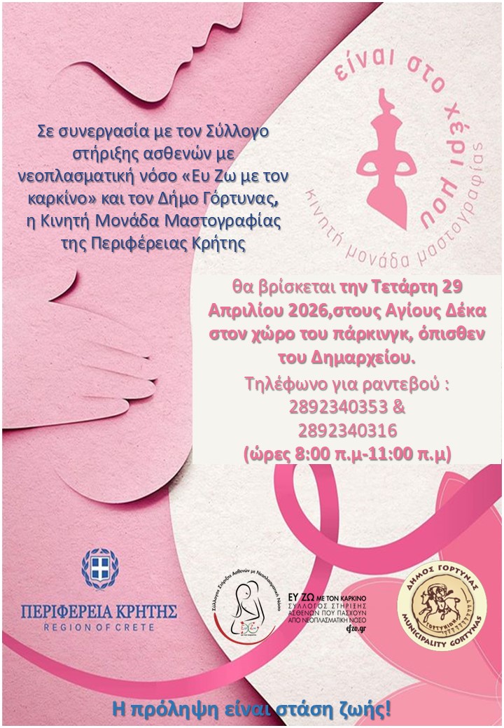 Η δράση, που διοργανώνεται από την Περιφέρεια Κρήτης, τον Δήμο Γόρτυνας και τον Σύλλογο στήριξης ασθενών που πάσχουν από νεοπλασματική νόσο «ΕΥ ΖΩ με τον καρκίνο», θα δώσει την ευκαιρία σε γυναίκες (με προτεραιότητα σε γυναίκες που δεν έχουν υποβληθεί ποτέ σε μαστογραφικό έλεγχο και σε ανασφάλιστες) να υποβληθούν, δωρεάν, σε μαστογραφικό έλεγχο.