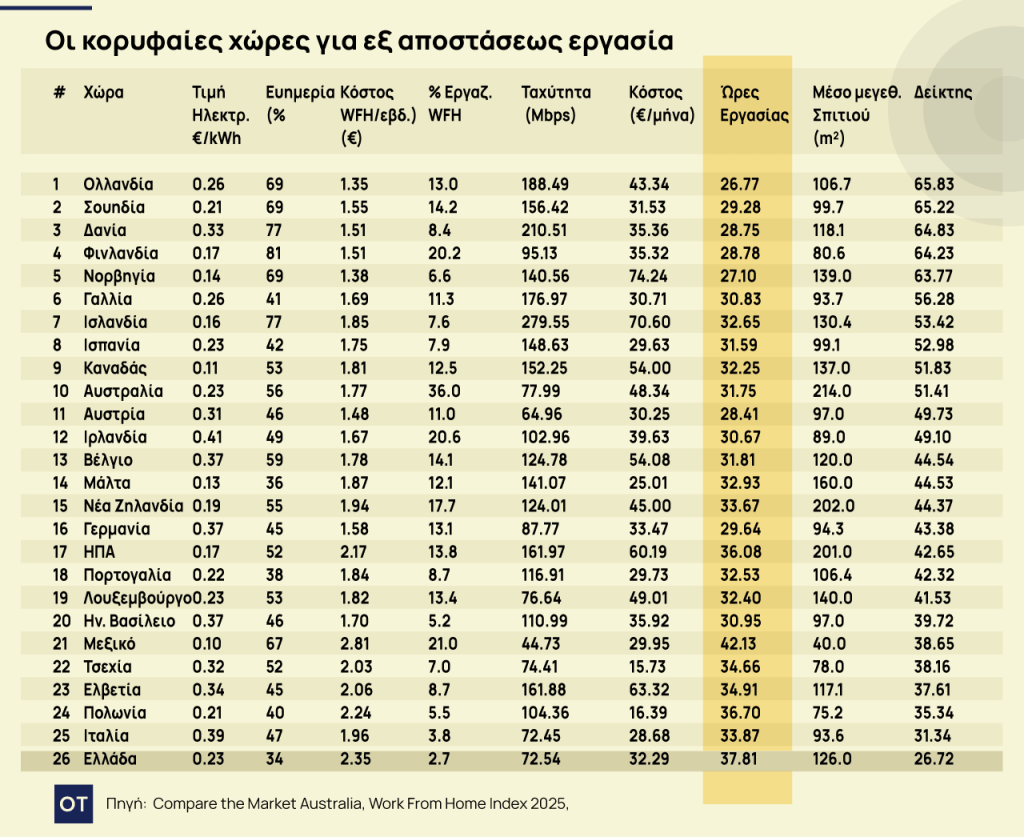 Τα σκήπτρα της πιο ευνοϊκής χώρας για εργασία από το σπίτι έχει η Ολλανδία με μέση ταχύτητα ίντερνετ 188,5 Mbps, κόστος ηλεκτρικού 0,26 €/kWh και μέσο εβδομαδιαίο κόστος εργασίας από το σπίτι μόλις 1,35 €, ενώ η Ελλάδα κατατάσσεται στην τελευταία θέση (26η) της σχετικής λίστας με μέση ταχύτητα ίντερνετ 72,54 Mbps, κόστος ηλεκτρικού 0,23 €/kWh και μέσο εβδομαδιαίο κόστος εργασίας από το σπίτι μόλις 2,35 €, δηλαδή κατά 75% ακριβότερο από την πρώτη χώρα της κατάταξης.