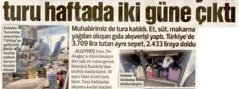 Όπως αναφέρεται στο ρεπορτάζ, οργανώνονται «εκδρομές αγορών» προς τη Αλεξανδρούπολη, με λεωφορεία που αναχωρούν κάθε Τρίτη και Παρασκευή βράδυ από το Καντίκιοϊ της Κωνσταντινούπολης. Το εισιτήριο κοστίζει 30 ευρώ και οι συμμετέχοντες πραγματοποιούν αγορές σε ελληνικά σούπερ μάρκετ έως το βράδυ της ίδιας ημέρας.